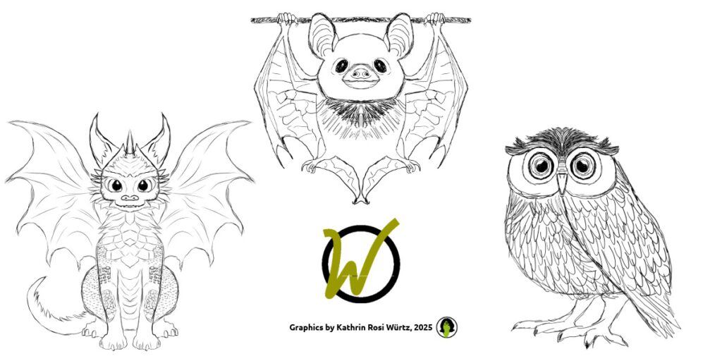 Heute hat die Krimi-Crew in Kinnis Welt den Vorhang gelüftet und sich erstmalig gezeigt. Bisher waren nur die dunklen, geheimnisvollen Schatten von Kletterdrache Kinni, Steinkauz Athene und Zwergfledermaus Pipistrella zu sehen. Ab heute zeigt sich die Krimi-Crew aus dem Siebengebirge zumindest schon einmal als Entwurfsgrafiken.