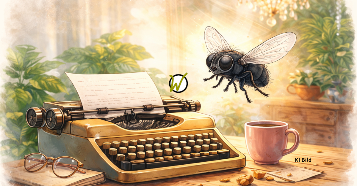 Stubenfliege Susi schreibt Schreibmaschine